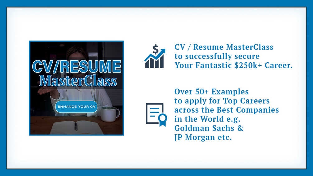 The CV MasterClass contains up-to-date engaging content using the latest strategies for CVs and it is aimed at professionals seeking a $250k+ Career such as you, who are eager to succeed and want advice from an Investment Banking Veteran - rather than simply an author of a boring book full of filler useless content that would be outdated.