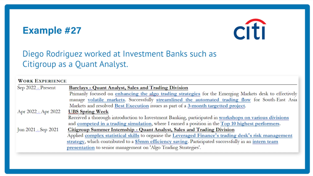 These 50+ examples span over Tier 1 Investment Banks, Top Hedge Funds, Phenomenal Private Equity Firms, Amazing Asset Managers, Accounting Firms, Management Consultancies, FinTech and Cryptocurrency firms.