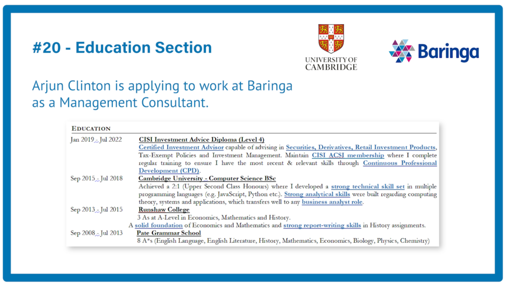The CV MasterClass includes relevant guidance such as overcoming a lack of relevant experience or sub-optimal academic performance when crafting Your CV. And, it contains over 50+ examples of professionals aiming for careers in top firms.